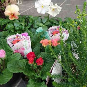 バラ、ナデシコ、マリーゴールドの寄せ植え。後ろの草は何でしょう? 色合いと形とバランスがお気に入りです。 いい感じ ( ・∇・)
