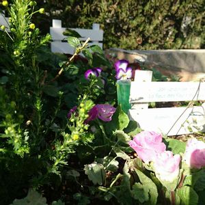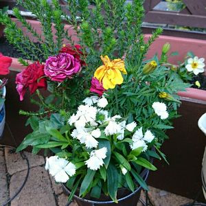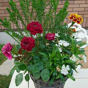 おはようございます。バラ、マリーゴールド、ナデシコの寄せ植え。