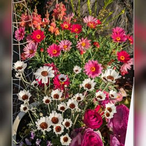 マーガレット シンプリーコーラル 本当にお迎えして良かった🎶😊 一株で色んな花色が楽しめます キンギョソウ ローダンセマム ゴールデンクラッカー ラナンキュラスも一緒に寄せ植えしてあります