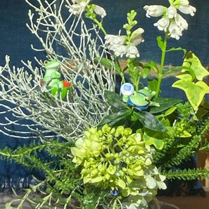 未明からの大雨は朝には上がり気温も⤴️ 先週✂️した庭花涼しげシリーズです スイカに乗った少年と暑さにだらけケロで🏷6日はカエルの日に参加させて頂きますね♪ 北側の窓辺は花保ちがよく長〜く楽しめます❣️