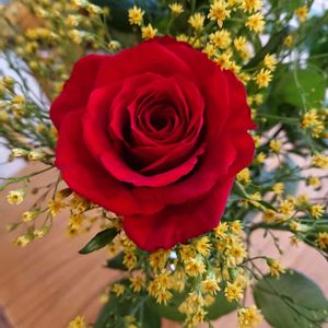 久しぶりに 切り花の 薔薇🌹さんを購入しました😄🎵🌹 やっぱり 真っ赤な薔薇🌹さんは一際 美しいな~🎵❤️ このお友のお花の 名前を教えて下さい🙇🌿💛 久しぶりに 🏷️真っ赤な火曜日 参加させて下さい🙇❤️