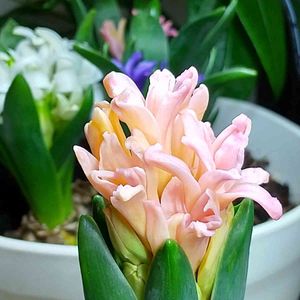 ヒヤシンスの水耕栽培やってます😊 小学校の時以来だから何十年ぶりになるのかしら?(*≧m≦*) それも珍しいサーモンピンクちゃん😍 だいぶ大きくなりました💓 後方には去年の鉢植えトリオです💙💗🤍