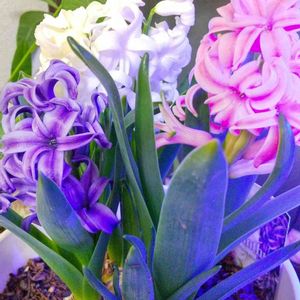 3色植えのヒヤシンス 咲き揃いました💗🤍💜 でも、2年目の子達で栄養が足りなかったのかな🙄 寸足らずのちんちくりんだけど (*≧艸≦) 香りはとってもグーですよ〜 クンクン (*´ω(・ω・*)