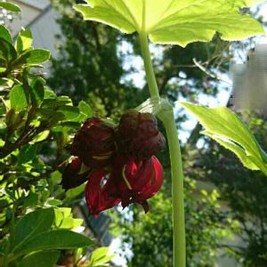 4月18日撮影 所沢 多聞院 ハッカクレン メギ科ハッカクレン属 これはテンナンショウではないですね。 でも葉の形や花の上に葉があることからちょっと仲間っぽく思っていました😆 ハッカクレンであることは、耕心館で葉を見ていたので分かりました。 ハッカクレンは台湾や中国の深山の林床に生える大型の植物です。 太い茎の先端に大きな角のある葉を2枚広げ、葉の下に赤褐色の抱え咲きの花を数輪咲かせます。このハスに似た葉の角の数から「六角蓮」や「八角蓮」と呼ばれています。また、2枚の葉のつけ根部に花が咲くものを「タイワンハッカクレン」、茎の途中に咲くものを「チュウゴクハッカクレン」と呼び分けられています。2枚の葉は広がった段階で成長を止めます。花はやがてボール状の実になり、タネがはじけます。冬前にはがっちりしていた茎もやわらかく倒れて落葉し、休眠に入ります。地下には堅いバルブ状の根茎が連なり、大きな次の芽が形成されています。 (みんなの趣味の園芸 より) この花は、2枚の葉の付け根に咲いているので、タイワンハッカクレンということでしょうか?