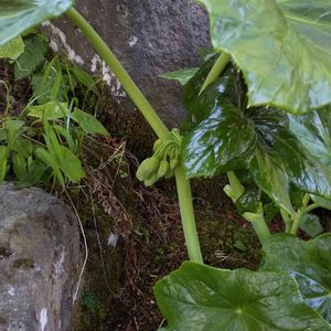 お寺の裏山に育っていた子。大きな葉っぱに、幹が分かれる付け根にツボミ?か実?が付いてます。見たことが無くて、さっぱりわからない🐰