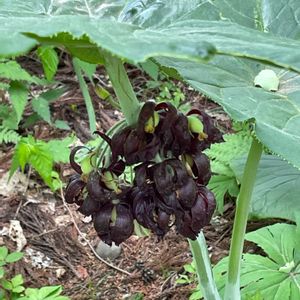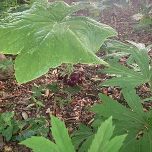 おはようございます♪ 神代植物公園の散策 🖤八角連(ハッカクレン)🖤 メギ科 ハッカクレン属 多年草 大きな角のある葉を2枚広げ、葉の下に赤紫色の丸い花を数輪咲かせます 蓮に似た葉の角の数で「六角蓮」や「ハ角蓮」と呼ばれています 漢方で解熱剤としても利用されています