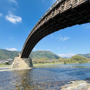 植物ではなくてすみません😅 番外編 錦帯橋を見上げてみました 美しかったです😍 食いしん坊プー子はとりあえず川の水を味見しています🐶