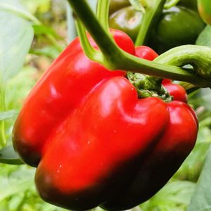 赤くな〜れ、赤く な〜れ パプリカです😊 色付くまでが長く、先に虫に食べらるなどしています🐛 ピーマンは収穫がはやいのになぁ🫑