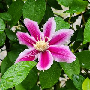 雨降る中、蕾開いた\(*´ `)/~💓クレマチス 可愛いお花が咲きました。 ⁺‧͙⁺˚☂️•̩̩͙⁺˚ 🩵⁺‧͙⁺˚☂️•̩̩͙⁺˚