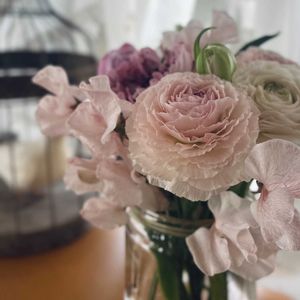 ネットで購入したラナンキュラスが届きました♡ なんというかわいさ😍 淡色のスイトピーがいい香り〜♡♡♡ 切花延命剤を入れて、 お願いだからあんまり咲かないでと 念じながら愛でています🥰