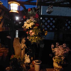 今日の夜の「祈りと癒しの園」(三角パーゴラ)です。 見ていると、とても心が静かになっていきます。 植物にかこまれた「祈りの天使」の足元で、「キノコで休む妖精」が、ソーラーランタンライトの薄明かりに浮き出されているライトな感覚が気持ちを楽にしてくれました。