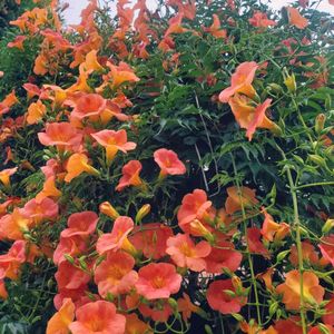 ノウゼンカズラ🔔 🐶お散歩中~近所に咲いていて巨大。 左端~電柱に巻き付いて上まで登ってる😅 電柱…大丈夫なのか?