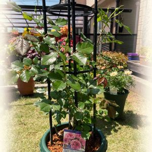 🌹ローズ・ポンパドゥール(デルバール) 🌿枝が混み合ってきたので、出開きを少し落として、オベリスクを立てました。 枝を広げてあげたので、風通しが良くなったかな(*´∇`*) 来月の開花に向けて、病害虫予防の薬剤散布も3種類をローテーションで使用しています(*^▽^*)
