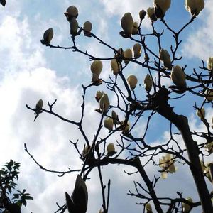 おはようございます 雨曇りの空の下 ハクモクレンが咲き出した 青空だったらなぁ〜(^_^*) 明日、晴れたらまた来よう 老木だけど今年も一番に咲いてくれました 花言葉は〈気高さ〉