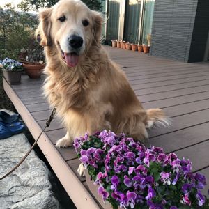 プランターをデッキに運んで 愛犬とパチリ! どっちも可愛い❤️