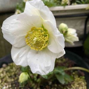 おはようございます😊 またひとつクリスマスローズ咲きました🤍 3,4年前に近くのホームセンターで数種類の花の寄せ植えに入っていたクリスマスローズ。。 シングル咲きだと思ってたんだけど咲いたらダブル咲き。。 毎年咲いてくれてるのに覚えてない。。😂💦 今年はいつもより多めにつぼみがついていてこれからが楽しみです🎶💓