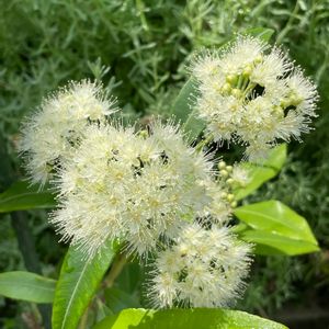 おはようございます😊 レモンマートルのお花💚🤍 爽やかな感じで咲いてます🎶 昨年お迎えしたばかりなのですが花が咲いてくれるとは思ってなくて嬉しい〜🎶💕