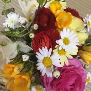 庭に咲いているお花でラウンドブーケを作りました。 ラナンキュラス•マーガレット•フリージャー•スイセン•アイビー🌸💐🌼