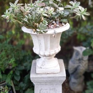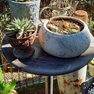 春に作った多肉の寄せ植えが、 増えてモリモリになってました。 でもゴブレットの端から垂れ下がる予定だったハートカズラが生育不良。
