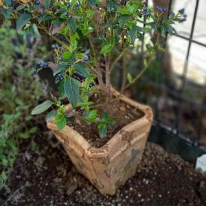 メタリックブルーの実が美しい、 ビバーナム・ティヌス。 酷暑で葉っぱがチリチリになって心配しましたが、 新葉が出てきて復活しました。 大規模修繕が終わったら地植えにしたい。