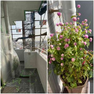 私には衝撃的😰センニチコウの入った大きな寄植え、室内に取込みできず塗装工事の時バルコニーに残しました。バルコニーに無いと思ったら、養生シートでびっちりカバーされてました😰さぞかし3日間息苦しかっただろうに、なんとか耐えてました💕