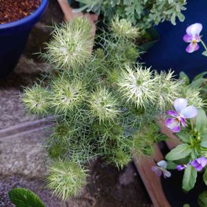 不思議な花弁が無い緑だけのもこもこニゲラ🤣グリーンマジック╰(*´︶`*)╯♡ 毬藻の様な蕾?から…開くと白っぽくなり実はピエロ🤡の帽子のような形だそう🤣楽しみです💕