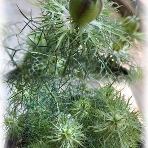 緑色のニゲラ。 買ってから花が咲かないと書いてあることに気づきました。 植え付けて1ヶ月位で種ができてます。 ピエロの帽子みたい。