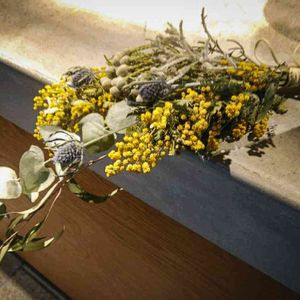 ミモザの日に間に合わなかった💦けど、 我が家の鉢植えの小さなミモザとクリスマスローズとユーカリ少々、家にある物で、ハーフリースとスワッグを作ってみました💛💛💛🥰 去年のスワッグさんとバトンタッチです😄