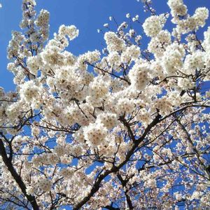この時期に咲くんですが 木肌は桜っぽいんだけど花が真っ白なんですよね😊 桜なんですかね? 次の写真に花のアップ載せておきます