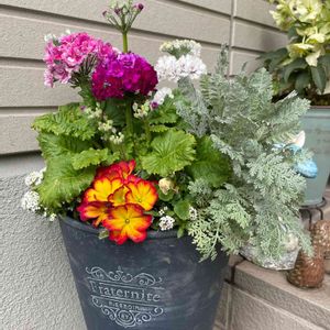寄せ植え プリムラ ジュリアンの色に元気が出ます。 裏の見えない所に斑入りツルニチニチソウも入ってます。 桜草 アリッサム シルバーレース