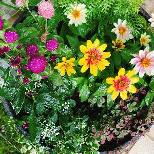 寄せ集めの寄せ植え マリーゴールド アフリカンとダイアモンドスターは追加で我が家に来ましたが、他のは他の寄せ植えにしていたものの組み合わせ。