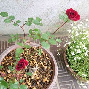 ミニバラが開きました🌹🌹 蕾があと2つあります🎵 ミミズが住んでいた鉢から植え替えたものなんですけど、葉の状態も良く元気になった気がします😊 今日は風が物凄くて、庭の方だとうまく写真が撮れず…。 隣にいるひなそうも避難させました。 この間も強風が当たって倒れまくっていました😨💦