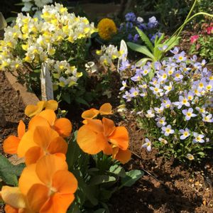 オレンジビオラ 薄紫ひなそう 黄白ネメシア 春らしい感じです