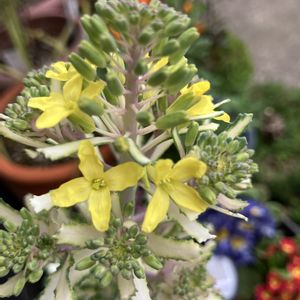 ずっと天気が悪くて庭チェックを怠ってたらいつの間にか葉牡丹のお花が咲いてました🌼.*😅