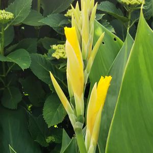 カンナ 散歩道でカンナの蕾にハッとさせられました。もうそんな季節だったんですね。後方には紫陽花の蕾も。