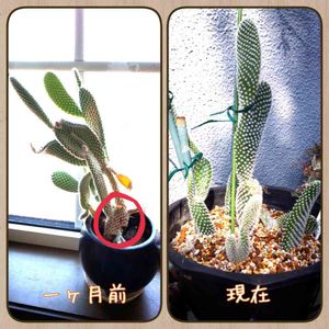 10年以上前、バニーカクタスだったもの…です笑 10数年前に伊豆のシャボテン公園で買ったときの記憶では赤○の部分だけ、可愛いうさぎだったハズなんですが… 随分ご立派なお姿になられておりました🌱 とっくに枯れてしまったものと思っていたら、実は実家で母が育てていたようです😃 先月実家に寄った際は左の伸び放題状態で、先日見たら右のようにちゃんと植え替えてありました😉✨ 全体的に綺麗なのに支えがサビサビの再利用品なのがうちの母らしいところです😁笑 いやーそれにしても…まだあったのかぁ💦