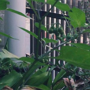 野ぶどうの小さな苗 葡萄のように房にならず一粒だけ実った 赤紫→紫→藍色への 変化が美しい