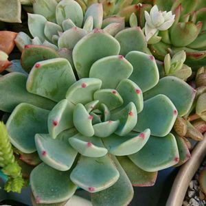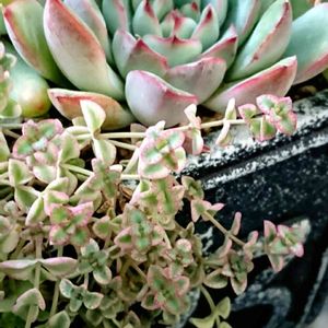 この子のお名前教えて下さい😃💦 他のエケさん達は縁取りのように赤く紅葉したのに この子は爪先だけ赤くて… 何気に可愛くて好きなんです😍 何を寄せ植えしたのか分からないなんて💦 永遠初心者🔰(笑) 七福美尼❤️と教えていただきました😆 ありがとうございました🎵
