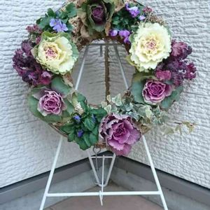 お花も多肉も完全防備しました(๑•̀ㅂ•́)و✧ この辺は全くと言っていい程❄️なんて降らないから超ビビってます💦 葉牡丹リース✨ 風の冷たさで外葉が枯れ気味ですが完全に根付いて立て掛けられるように😆💓