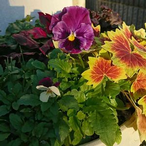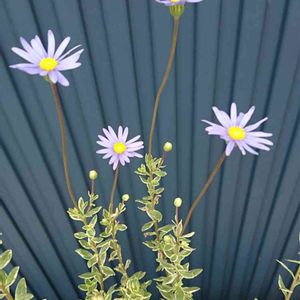 春に咲かなかった 斑入りのブルーデイジー🌼 夏の間も水を切らさないようにあげ続け ようやく咲き始めました😂