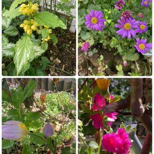春のお花🌼🌸💐いつも間にか咲いていたお花達 ↖️ラミウム。あちこちで咲いてます。 右上、ブラキカム 左下、チューリップ🌷 ↘️ツツジ ツツジは、1年中邪魔だなとおもって、アイビーを這わせたり、ハート♥️型に剪定したりしましたが、いい色やはり残しておいてよかったです。