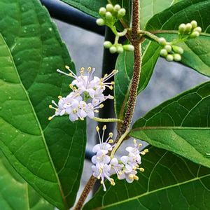 枯れたみたいな枝でした。根っこが元気そうだったからダメ元で花壇の隅に軽く植えたら葉っぱが繁りだして、小さな花をつけました。 おそらく、コムラサキシキブ。 紫の実、楽しみだぁ💜