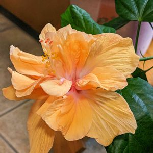 ハイビスカス🌺八重咲 庭で虫を避ける為→玄関に避難!元気になって花まで咲いてくれました🤭カワイイ💕