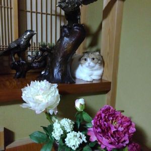 カラちゃん探してたらこんな所に。ここは仏間。置物と、(ワシかタカかトンビかわからないのですが)デパートで買った芍薬の飾り物と一緒にパチリ‼️