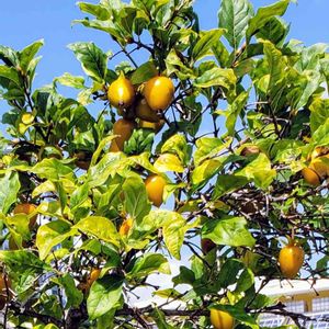 老爺柿でしょうか? 樹木の高さ約2メートル 果実の大きさ縦長約5センチ 葉は細長いです。