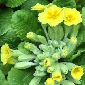 サクラソウ ピンク色が終わりかけて黄色が咲き始めました。 蕾が沢山ついてますが、これで一株なんです❗️ 確か、昨年もこの株だけ凄かった‼️ これだけの蕾を支えて咲かせるのだから、 茎が分厚くて平かったです。