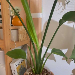 ⚘⚘⚘ストレリチアオーガスタ⚘⚘⚘ 購入時は50㎝でしたが、我が家に来て3年が経ち、細身ですが90㎝になりました。 本日、一回り大きい鉢に植え替えたので、ストレリチアさんの心地よい置き場所を探しましょう( •ॢ◡-ॢ)-♡ 茎が折れた株はジャングル化の植物たちに支えてもらいましょう🪴