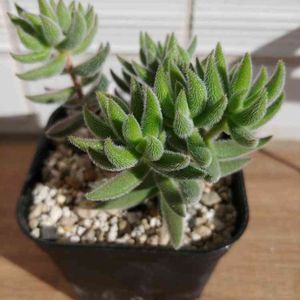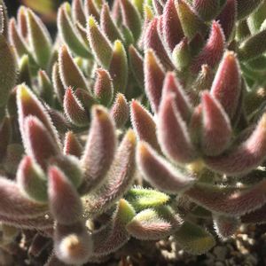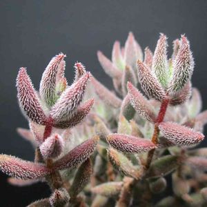 約一年ぶりの銀箭. 冬姿はいつも通り, 少しピンクが掛かった焼き加減に. 例によって,陽に白く輝く繊毛を全身につけて,コートを着ているようです. このモフモフ系の姿だと,クラッスラでも案外簡単に冬越えできそうに見えます.