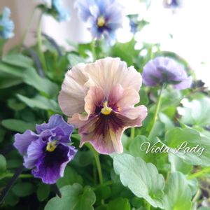 ビオラ レディ 手前と奥の濃いピンクは別株なんだけど、ブルー?とアプリコット?は同じ株です …この花色の説明難しい😂 ブルーで咲いて→アプリコットに変化します なかなか激しい変化です