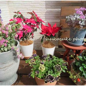 以前の載せたプリンセチアとポインセチア♡まだまだ元気です(*^^*) 今まで和室の窓辺に居ましたが、ウッドデッキが出来たので外に出すことのに(*´∀`*)一度はそれぞれ赤い花がなくなり駄目にしちゃったかもと思ってた2つでしたが、ここまで回復してくれて嬉しいです☆彡